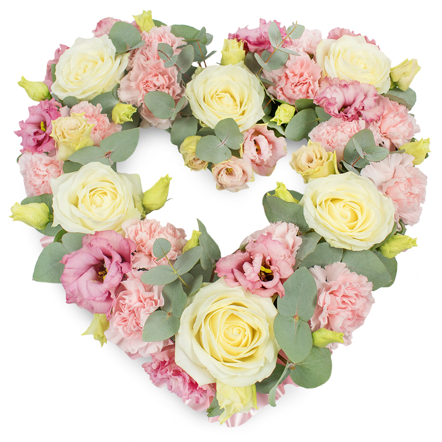 Show your love and appreciation with our Charming Heart Floral Arrangement. This beautiful bouquet showcases a harmonious mix of white roses, pink carnations, and pink lisianthus, paired with fresh eucalyptus leaves for added elegance.